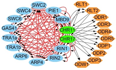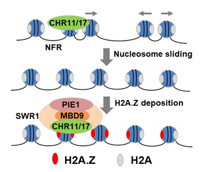 The multi-subunit SWR1 complex is responsible for exchanging the H2A/H2B dimer of the nucleosome with the free H2A.Z/H2B dimer, thereby depositing H2A.Z into the chromatin in eukaryotes. Components of the SWR1 complexes have been well identified and characterized in yeast and metazoans. Most of the conserved SWR1 components identified in yeast and metazoans have also been found in Arabidopsis, suggesting that the SWR1 complexes are conserved in eukaryotes. However, it is unknown whether there are non-conserved SWR1 components that are exclusively present in plants. In this study, Dr. Xin-Jian He’s laboratory identified all components of the SWR1 complex in Arabidopsis and found the following three classes of previously uncharacterized plant-specific SWR1 components: MBD9, a methyl-CpG-binding domain-containing protein; CHR11 and CHR17 (CHR11/17), ISWI chromatin remodelers responsible for nucleosome sliding; and TRA1a and TRA1b, accessory subunits of the conserved NuA4 histone acetyltransferase complex. MBD9 directly interacts with CHR11/17 and the SWR1 catalytic subunit PIE1, and is responsible for the association of CHR11/17 with the SWR1 complex. MBD9, TRA1a, and TRA1b function as canonical components of the SWR1 complex to mediate H2A.Z deposition. CHR11/17 are not only responsible for nucleosome sliding but are also involved in H2A.Z deposition. The results indicate that the association of the SWR1 complex with CHR11/17 may facilitate the coupling of H2A.Z deposition with nucleosome sliding, thereby co-regulating gene expression, development, and flowering time.