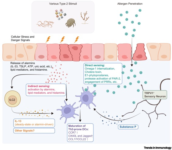 文章的另一条主线聚焦于树突状细胞如何获得驱动Th2分化的能力。树突状细胞是连接外界刺激与适应性Th2反应的关键桥梁,其中IRF4依赖的cDC2是启动II型反应的核心亚群,而不同cDC2分支在Th2和Th17极化中又表现出进一步分工。由于II型刺激物本身高度异质,树突状细胞同样难以完全依赖经典PAMP-PRR模式对所有刺激作出直接响应。因此,在多数情形下,DC更可能通过整合来自上皮细胞、ILC2及感觉神经的宿主信号而获得“Th2-prone”功能状态。这类DC通常表现为CCL17、CCL22、OX40L和Jagged等分子的上调,以及IL-12、IL-23、IL-6等I型或III型极化因子的抑制。